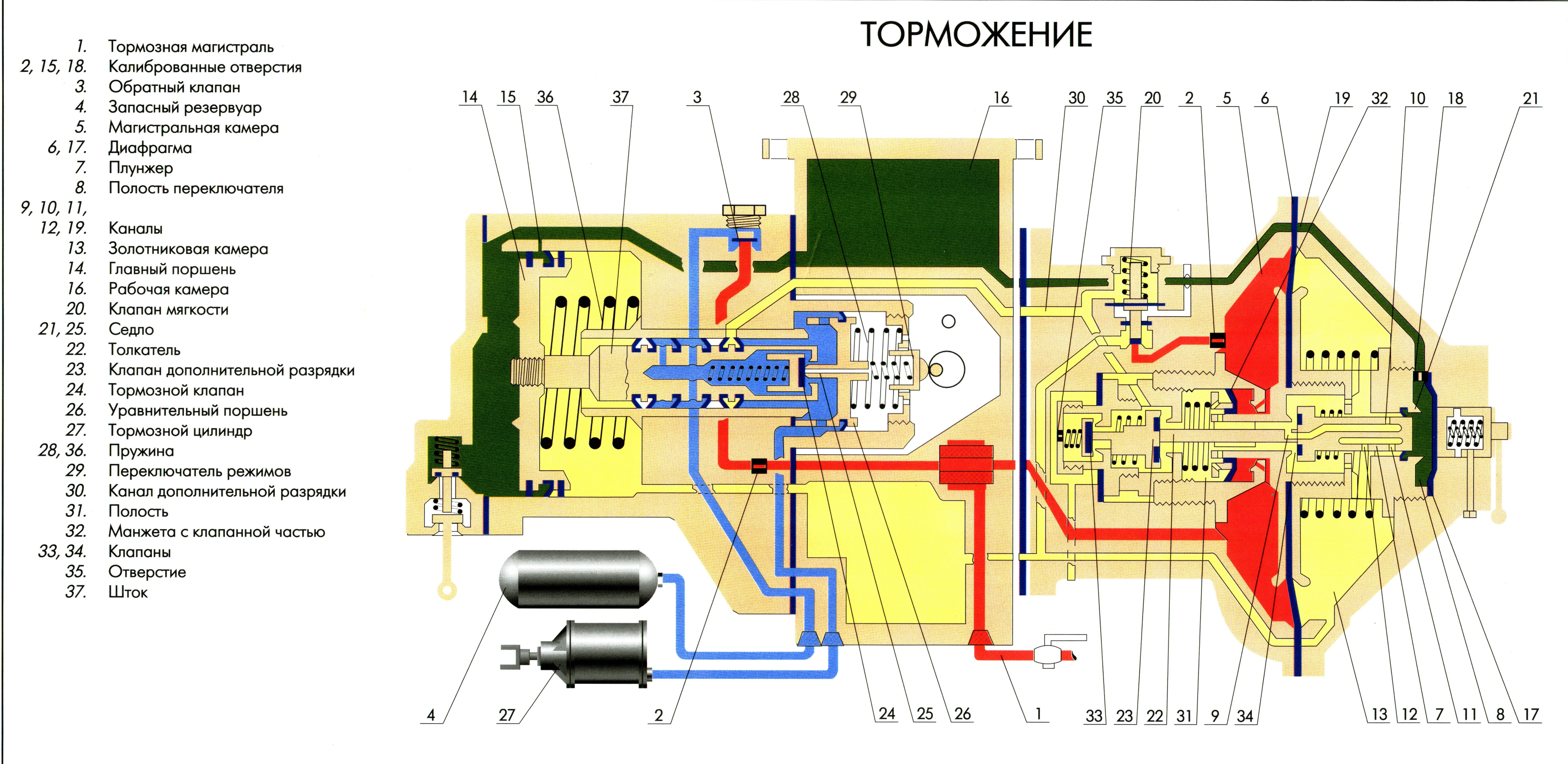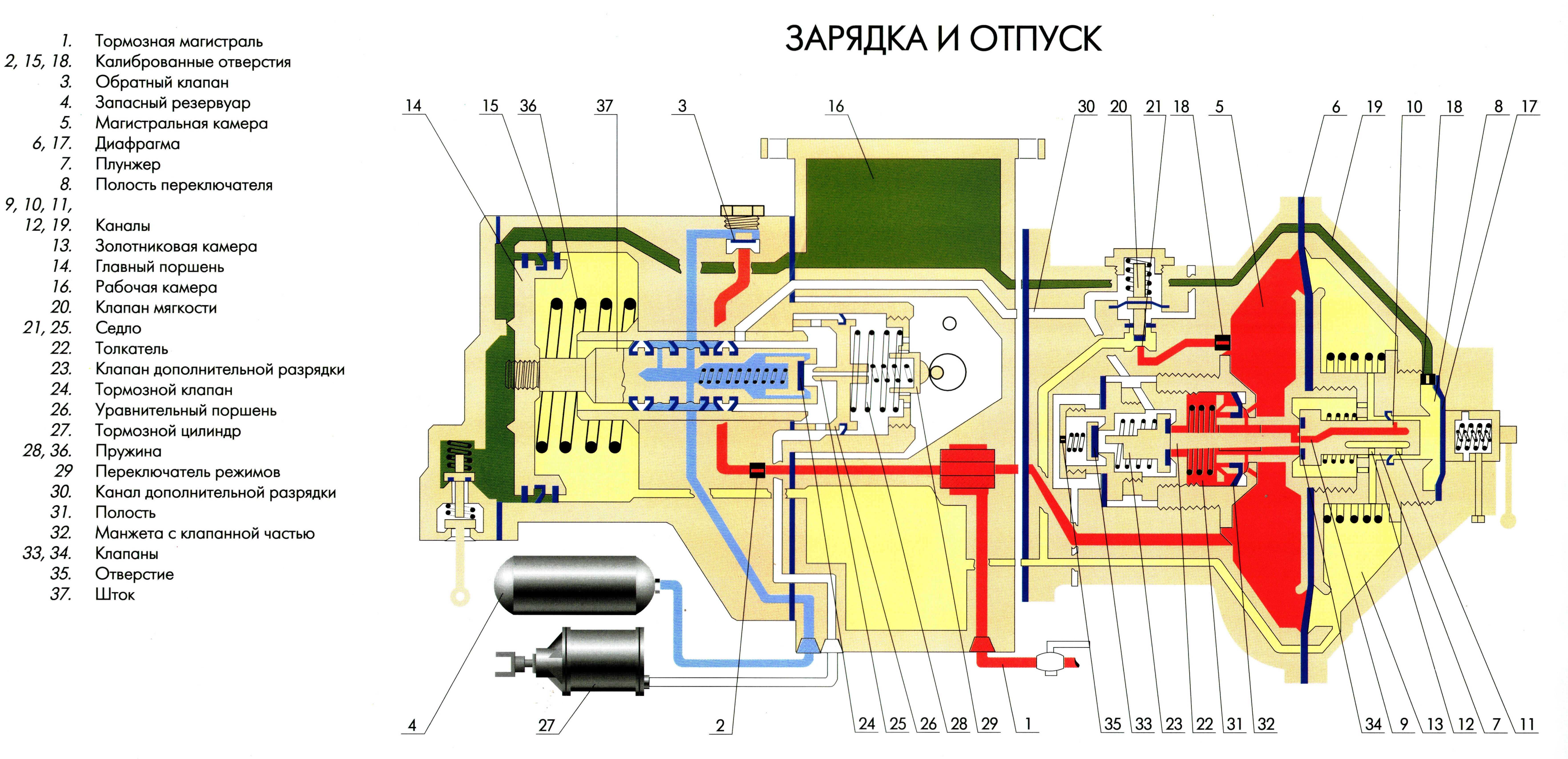 Итак, магистральная диафрагма прогнется влево. Вначале прогнется совсем чуть-чуть. При этом плунжер, который вставлен между дисками диафрагмы и, естественно, перемещается вместе с нею, толкнет толкатель 22, он, в свою очередь, толкнет клапан дополнительной разрядки 23 (будем называть его клапан ДР); он отойдет от седла и сообщит полость слева от манжеты дополнительной разрядки 32 (манжеты ДР) с атмосферой через канал дополнительной разрядки: