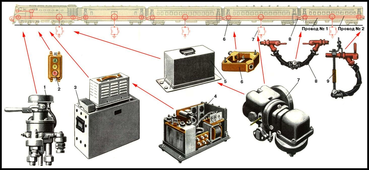 На пассажирских поездах с локомотивной тягой применяется двухпроводный электропневматический тормоз. Вдоль всего поезда проложены линейные провода тормоза: провод № 1 — рабочий, предназначенный для управления действием электровоздухораспределителей, и провод № 2 — контрольный, для сигнализации машинисту о состоянии цепи управления. В качестве обратного провода используются рельсы железнодорожного пути.