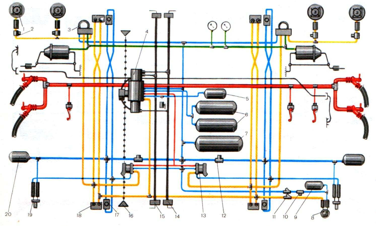 Для отключения в случае обрыва шлангов к регуляторам 1 установлены вентили 2, а к датчикам 19 — вентили 12. Резервуары 5, 20 и 9 образуют дополнительные емкости в системе тормоза.