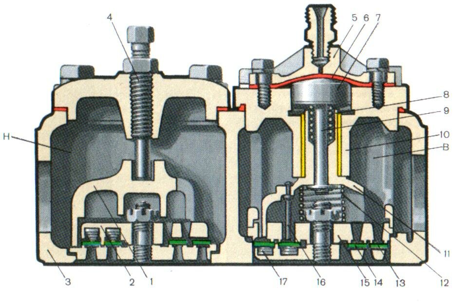 Внутренняя полость клапанной коробки (рис. 3) разделена перегородкой на две камеры: всасывающую В, в которой расположен всасывающий клапан 15 с разгрузочным устройством и нагнетательную Н, в которой расположен нагнетательный клапан 2. Нагнетательный клапан 2 прижат к корпусу коробки винтом 4 через упор. Механизм разгрузочного устройства состоит из упора 11 с тремя пальцами 16, крышки, диафрагмы 6 и стержня с диском 9. Направляющей для упора служит втулка, запрессованная в крышку.