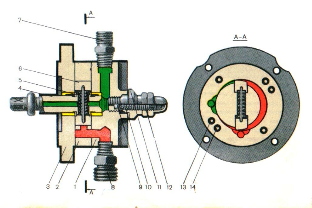 При вращении коленчатого вала, а следовательно, и приводного валика по часовой стрелке (если смотреть со стороны квадрата валика), каждая лопасть создает разрежение в полости, изображенной красным цветом. Вследствие этого масло из фильтра картера компрессора через подводящую трубку («вход масла») засасывается в эту (красную) полость и нагнетается в полость зеленую, откуда по каналу через штуцер масло поступает к манометру, а через отверстие в приводном валике — в смазочные каналы коленчатого вала («выход масла») и подшипники. Подвод масла к манометру, поступающего из насоса с целью устранения колебания стрелки манометра, выполнен в виде штуцера, в который ввернут ниппель с калиброванным отверстием 0,5 мм и поставлен резервуар объемом 0,25 л.