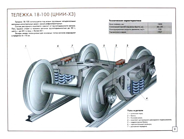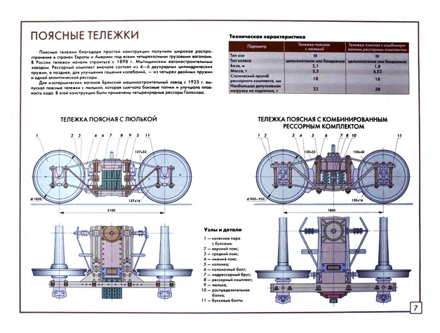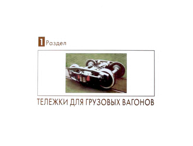 В альбоме приведены наиболее интересные модели грузовых и пассажирских тележек как первой постройки эксплуатационного парка, так и вагонов нового поколения. Современные тележки грузовых вагонов позволяют эксплуатировать поезда со скоростью до 140 км/ч, обеспечивая передачу осевых нагрузок до 25 т и погонных нагрузок — до 10,5 т. Изменилась конструкция наиболее повреждаемых узлов — горизонтальных скользунов, рессорного комплекта, узла соединения боковой рамы с буксами.