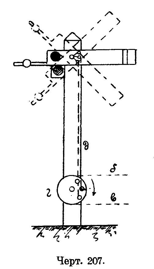 Семафоры (черт. 207) устраиваются в виде мачты с прикрепленными к ней подвижными крыльями, и такими же очками, снабженными стеклами сигнальных цветов для придания в темное время надлежащей окраски огням семафорных фонарей. Семафоры устанавливаются однокрылые и многокрылые. Семафор, как общее правило, должен давать два указания: «стой» и «тихий ход» (въезд на станцию разрешен). Сигнальное указание «стой» подается днем горизонтальным положением крыла, причем ночью в сторону поезда фонарь бросает красный огонь, а в сторону станции — белый контрольный огонь. Указание же «путь свободен» подается днем наклоненным кверху под углом в 135° к горизонту положением крыла, а ночью в сторону поезда фонарь бросает зеленый огонь и в сторону станции тоже зеленый контрольный огонь. Иногда же семафорами, кроме указанных двух указаний, подается еще и третье указание: «тихий ход», т.-е. въезжай на станцию осторожно. Последнее указание, а именно—«тихий ход», подается опущенным книзу под углом в 45° положением крыла, ночью же в сторону поезда бросается огонь тоже зеленый.