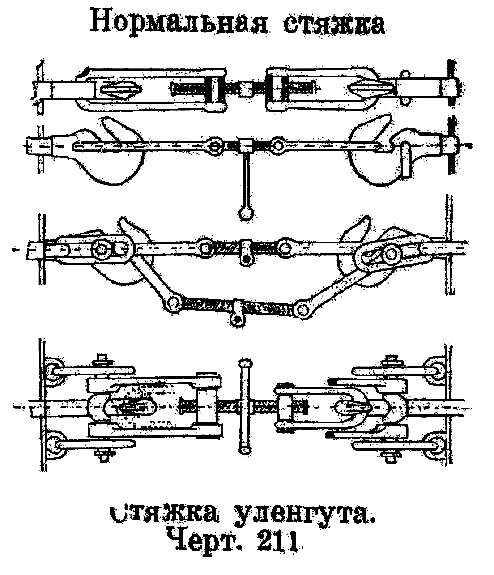 Винтовая гибкая стяжка состоит из винта с нарезкой в разные стороны от средины его, двух гаек с цапфами, двух скоб, надетых на эти цапфы, и рукоятки для свинчивания стяжки. Стяжка помимо усиления претерпела и некоторые конструктивные изменения. Несмотря на постоянно идущее переоборудование русского подвижного состава на наиболее сильную стяжку, еще и до сих пор все четыре типа стяжки находятся в работе. На черт. 211 показаны типы стяжек нормальной и Уленгута. Стяжка Уленгута применяется на пассажирских и специальных товарных (например, Фокс Арбеля) вагонах.