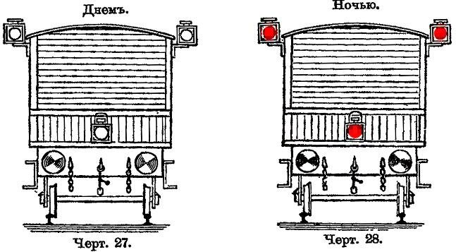 Вышеупомянутые три фонаря на концевомъ вагонЬ (черт. 27 и 28), служатъ указатемъ днемъ и ночью стацюннымъ агентамъ, переездной и путевой стражЬ, что поЬздъ слЬдуетъ въ полномъ составЬ.