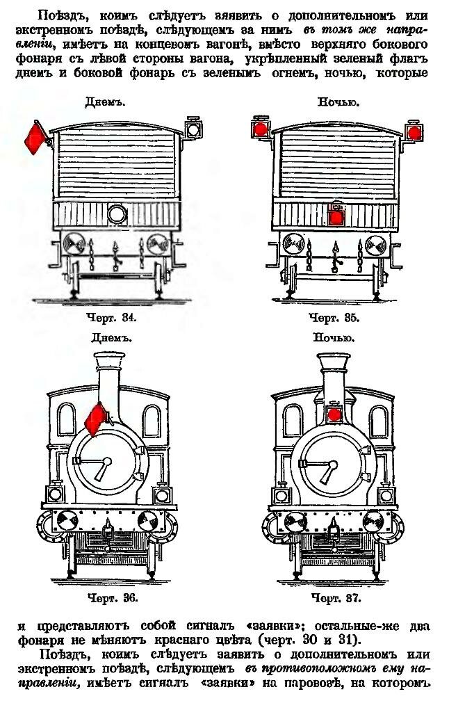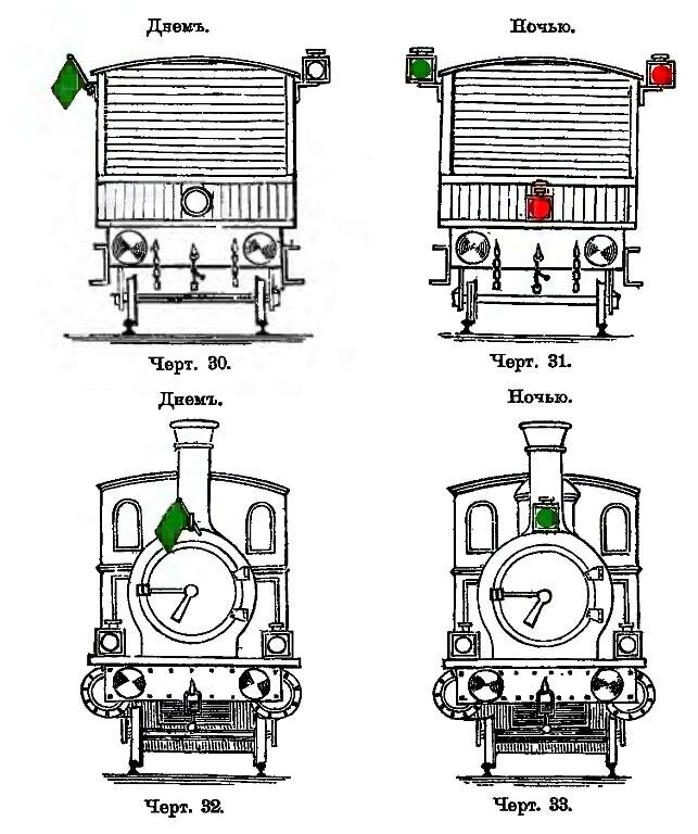 Какъ на паровозЪ, такъ и на концевомъ вагонЪ, пассажирскихъ и товарныхъ поЬздовъ, применяются сигнальные приборы, которые служатъ въ качествЬ дневныхъ и ночныхъ сигналовъ.
