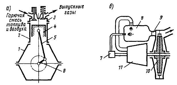 а — поршневой двигатель; б — газовая турбина