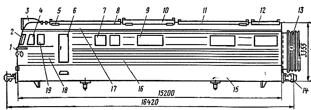 1-сигнальные фонари; 2-лобовое окно; 3- прожектор; 4,19-боковое окно; 5-люк песочницы; 6-дверь; 7-задвижное окно; 8,10,11,12-монтажный люк; 9-глухое окно; 13-брезентовое суфле; 14-автосцепка; 15-рама; 16-боковая стена; 17-крыша; 18-кабина