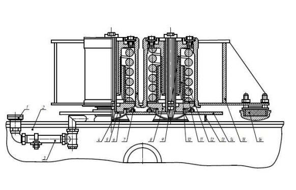 Масло в ванну заливают через маслопровод, состоящий из масленки, трубы и деталей смазочной арматуры. От попадания в ванну пыли, грязи, снега и т. д. она защищена крышкой 14 из листовой стали, имеющей отверстия для прохода опор и по периметру этих отверстий желоба под сальник.