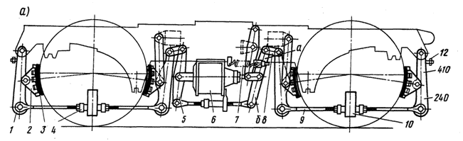 1-подвеска, 2-башмак, 3-тормозная колодка, 4-регулировочная муфта, 5-главные балансиры, 6-тормозной цилиндр, 7-отпскная пружина, 8-соединительная серьга, 9-тяга, 10-предохранительная скоба, 11-тормозная балка, 12-болт для регулировки зазора между колодкой и колесом