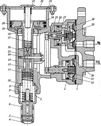 Хвостовики поршней 27 и 32 опираются на рычаг 25, а осью поворота рычага является сухарь 16.