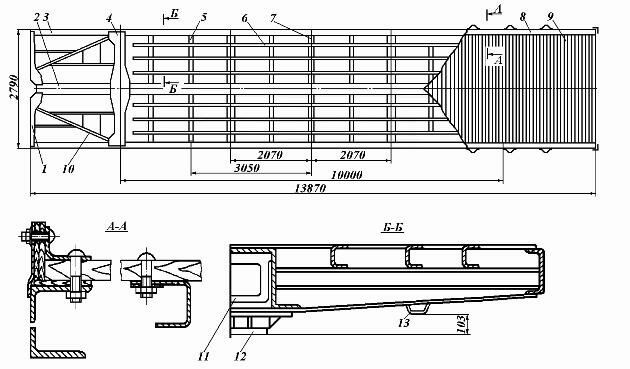 Шкворневые балки 4 сварные коробчатого сечения. Каждая из них состоит из двух вертикальных толщиной 6 мм, верхнего (8 мм) и нижнего (10 мм) горизонтальных листов. В местах пересечения шкворневых балок с хребтовой установлены стальные надпятниковые коробки 11, связывающие вертикальные стенки хребтовой балки, а также усиливающие пятниковый узел рамы. К нижним листам шкворневых балок приклепаны пятники 12 и скользуны 13.