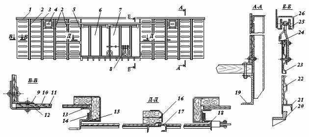 Боковая стена (рисунок 1.3) имеет каркас и обшивку: металлическую 11 наружную и деревянную 10 внутреннюю. Для загрузки и выгрузки вагона в средней части стены расположены самоуплотняющиеся двери 6 и 7 и два люка 4, снабженные вентиляционными решетками. Каркас стены включает обвязку 1, две шкворневые 3, шесть промежуточных 2 и две дверные 5 стойки. Верхняя обвязка 1 (разрез А-А) выполнена из уголка 90х56х8 мм, шкворневые и промежуточные стойки - из гнутого W - образного профиля толщиной 6 мм, а дверные стойки 13 (разрез Д-Д) - из Z-образного профиля размером 100х75х6,5 мм и направляющего уголка 15 размером 75х50х6 мм.