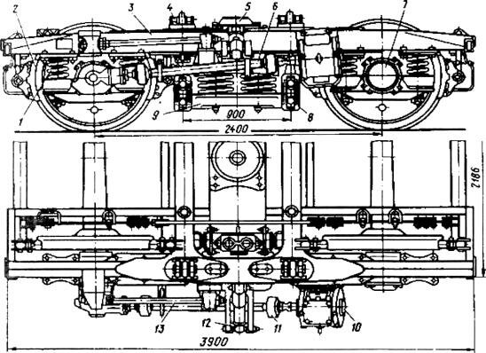 1-боковая балка; 2-поводковое устройство; 3-тяга; 4 - коробка для скользунов; 5-поддон;6-серьги; 7-планка крепления шпинтонов; 8-продольные скользуны;9-поперечные скользуны;10-тормозные балки;11-предохранительное устройство; 12-пружины; 13-гидравлический гаситель колебаний; 14-кронштейн;
