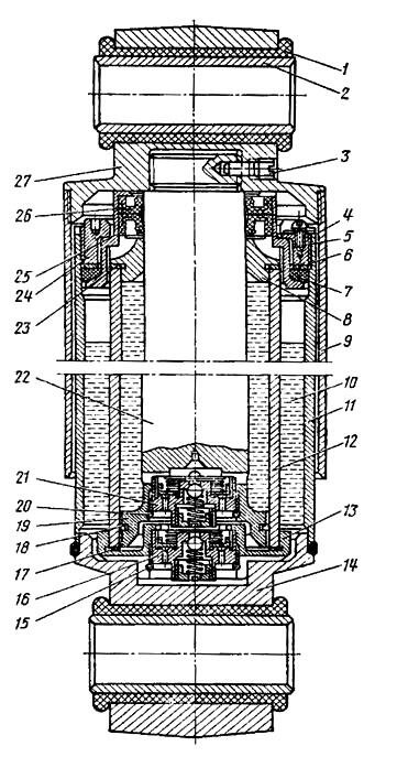 Нижний клапан закреплен с пружинным кольцом 15 во фланце 13, который свободно вставлен в углубление нижней головки 14. Через фрезерованные канавки головки нижняя часть клапана 16 сообщается резервуаром 10. К головке 14 приварен корпус 11, который является основой для сборки всех частей гасителя и, кроме того, наружной стенкой резервуара 10. Для защиты корпуса и штока от механических повреждений и защиты рабочей поверхности штока от пыли и грязи к верхней головке 27 привернут кожух 9, который почти полностью закрывает корпус.