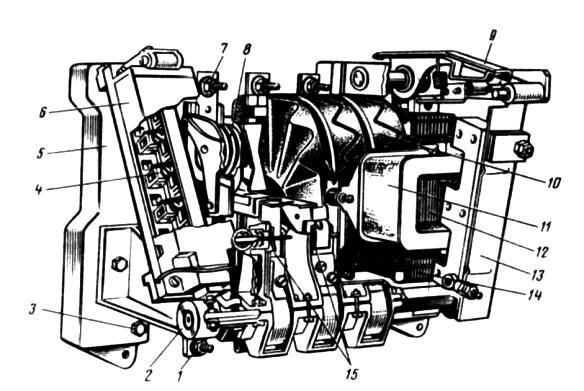 1 - зажимы подвижных контактов; 2 - ось (вал); 3 - зажим для заземления; 4 - блокконтакты; 5 - корпус; 6 - крышка блока блокконтактов; 7 - зажим неподвижных контактов; 8 - дугогасительная катушка; 9 – пружинно-фиксирующий механизм; 10 - дугогасительные камеры; 11 - катушка; 12 - неподвижный магнитопровод; 13 - планка; 14 - короткозамкнутый виток; 15 - подвижные контакты.
