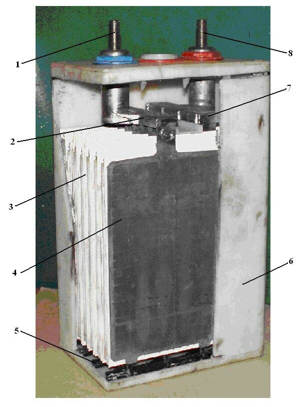 1,8 – положительный и отрицательный выводы (борны); 2,7 – баретка положительных и отрицательных пластин;