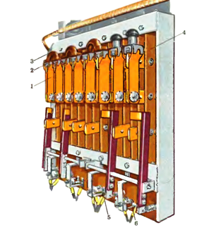 Устройство отключателей рассмотрим на примере аппарата ОД-8Б-2. На каркасе 1 (рис.2) укреплены контактные элементы. Каждый контактный элемент состоит из двух гетинаксовых стоек 9 (рис. 3), между которыми жестко установлены неподвижные контакты — верхний 2 и нижний 10 и кронштейн 7 подвижного контакта с двумя медными контактными ножами 6.
