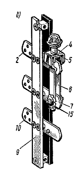 Своими выступами эти ножи прижимаются пластинчатой пружиной 4 к неподвижным контактам. Для улучшения контакта между кронштейном 7 и ножами 6 применены тарельчатые шайбы 15. Контактные элементы бывают одиночные с одинарной изоляционной рукояткой 5 на контактных ножах или спаренные с изоляционными рукоятками 3, соединяющими две пары соседних контактных ножей. У отключателя ОД-8Б-2 три спаренных и левый одиночный контактные элементы при нормальной работе тяговых двигателей должны иметь контактные ножи в верхнем положении.