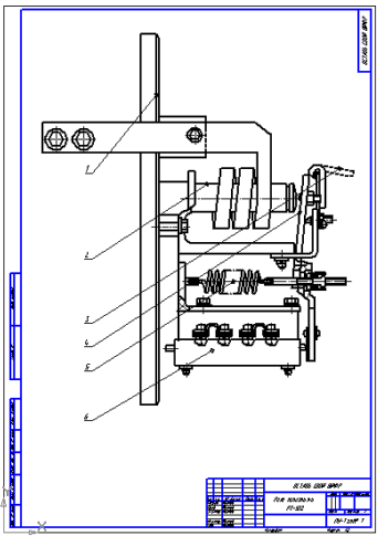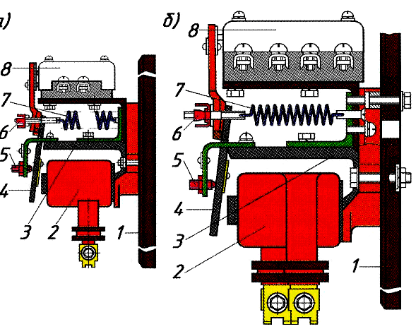 1 – изоляционная панель; 2 – катушка; 3 – магнитопровод; 4 – якорь; 5,6 – регулировочные шпильки; 7 – пружина; 8 – блок-контакты