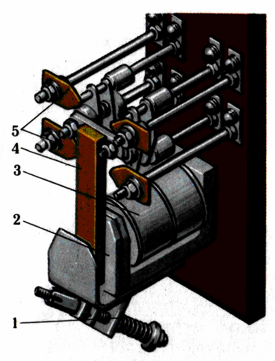1- изоляционная панель; 2 – токовая катушка; 3 – магнитопровод; 4 – якорь;