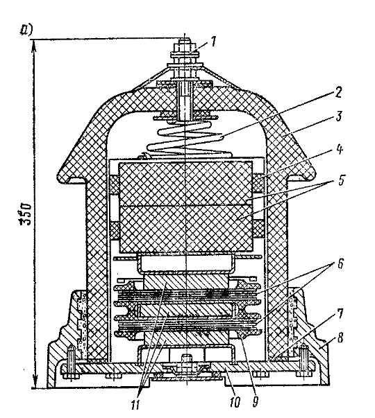 Все детали разрядника собраны внутри фарфорового кожуха 3 (рис. 1). Два вилитовых диска 5 с прокладками 4 от корпуса, два искровых промежутка 8 с шунтирующими резисторами 9 и постоянные магниты 11 цилиндрической формы (с полюсами — вверху и внизу) для гашения дуги прижаты к дну 10 пружиной 2.
