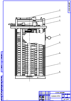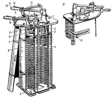 Контроллер КМЭ-8. Он имеет корпус, состоящий из литого основания 5 (рис.1), литой крышки 9 и вертикальных стоек. Спереди корпус закрыт кожухом 6, а сзади — съемным кожухом. На задних вертикальных стойках 3 и 8 укреплены контакторные элементы 7. Их подвижными контактами управляют кулачковые шайбы 4, насаженные на вертикальные валы 9. Валами 9 через передачу 2 управляет машинист с помощью рукояток контроллера.