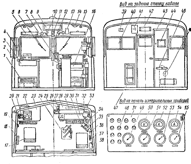 В верхней части пульта на наклонной под углом 60° плоскости установлена откидная панель с измерительными приборами. С целью исключения возможности попадания под высокое напряжение при поднятом токоприемнике панель оборудована специальным замком. На панели также нанесен знак высокого напряжения, служащий предупреждением обслуживающему персоналу.