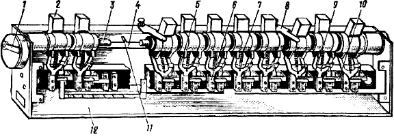 Внутри корпуса 12 (рис. 2), закрываемого крышкой, укреплена изоляционная планка 9 с неподвижными контактами 6. Подвижная система аналогична по устройству выключателю управления. Подвижные рычаги (кнопки) 2 свободно надеты на общий валик 3. В их вилкообразные нижние концы упираются подвижные контакты 5 под действием пружин 7. При повороте рычага контакт мгновенно перебрасывается и замыкается с неподвижным контактом. Поворот рычага в противоположную сторону вызывает отбрасывание контакта в отключенное положение до упора 10.