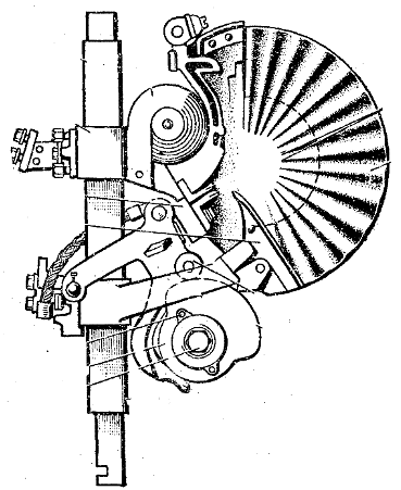 С переключением группового переключателя необходимо изменять схему цепей управления другими аппаратами. Для этого установлено блокировочное устройство, состоящее из блокировочного барабана, связанного с кулачковым валом через зубчатую передачу. А поверхности блокировочного барабана укреплены медные и фибровые сегменты, которых касаются блокировочные пальцы, укрепленные на пальце держателе.