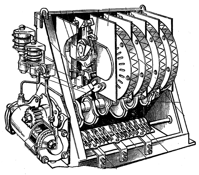 Если два пальца касаются медного сегмента - их электрическая цепь замкнута, если они касаются фибрового сегмента - цепь разомкнута Момент включения и выключения контакторных элементов определяется формой кулачковых шайб и их положением на кулачковом валу. При повороте кулачкового вала, перед включением контакторного элемента подвижной контакт некоторое время движется к неподвижному, а после их касания происходит притирание и затем полное включение.
