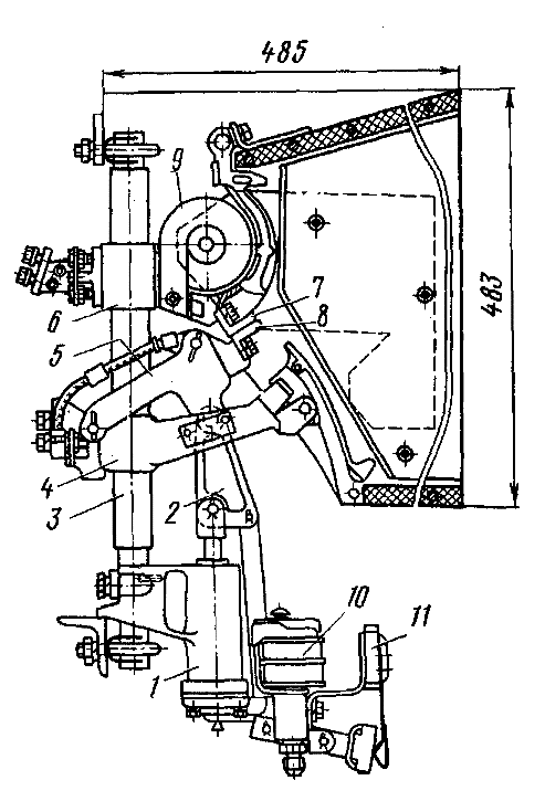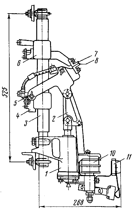 катушкой 9; кронштейн 4 подвижного контакта 8, который шарнирно соединен с рычагом 5; пневматический привод 1 и тяга 2. Пневматический привод состоит из цилиндра, выключающей пружины, поршня с уплотнительной резиновой манжетой и электромагнитного включающего вентиля 10.