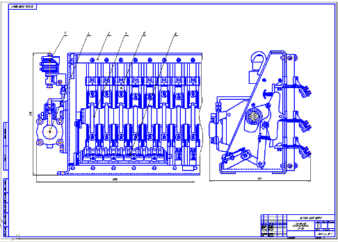 Кулачковый вал состоит из стального стержня квадратного сечения, на который насажены кулачки из прессмассы АГ-4. Он вращается в шариковых подшипниках, установленных в боковинах каркаса, от двухпозиционного электропневматического привода через зубчатую передачу. Этот привод состоит из пневматического цилиндра с двумя поршнями, соединенными между собой зубчатой рейкой, и двух электромагнитных вентилей включающего типа. При подаче напряжения на катушку одного из вентилей сжатый воздух по трубам проходит в соответствующую полость цилиндра и перемещает поршни с рейкой в одно из крайних положений, поворачивая через шестерню кулачковый вал.