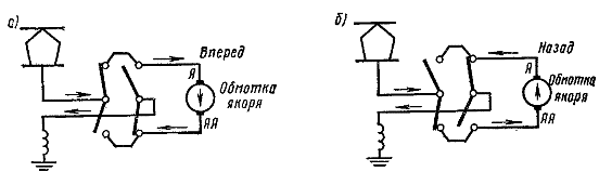 На электровозах ВЛ10 для упрощения электрической схемы переключают обмотки якорей. При этом напряжение между соседними контактами реверсора может достигать 3000 В. Различное положение контактов обеспечивает изменение тока в обмотке, показанное стрелками при движении электровоза Вперед (рис. 2, а) и Назад (рис. 2, б).