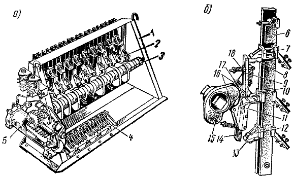 Тормозной переключатель ТК-8 имеет каркас 1 (рис. 3,а), состоящий из двух боковин и трех уголков. На нем установлены кулачковые элементы 2, кулачковый вал 3, привод 5 и блокировочное устройство 4. Кулачковый элемент собран на двух текстолитовых планках 6 (рис. 3,б), соединенных внизу и вверху распорками. На планки крепят кронштейны 7 и 12 с неподвижными контактами 8 и 13, а в средней части — кронштейн 10 подвижных контактов. На нем шарнирно установлено коромысло 11 с верхним 9 и нижним 14 подвижными контактами.