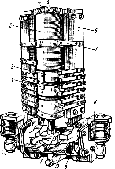 На двух изоляционных стойках 6 (рисунок 1) укреплены контактные пальцы 7: три верхние (два на левой стойке и один на правой) включают в силовую цепь двух двигателей вентиляторов, остальные 12 пальцев включены в цепи управления. Пальцы касаются медных 1 или фибровых 2 сегментов, укрепленных на бакелитовом барабане 3. В каждом из двух положений барабана через медные сегменты замыкаются соответствующие контактные пальцы, собирая нужную схему соединения двигателей вентиляторов, генераторов тока управления, сидящих на валу мотор-вентиляторов и других цепей.