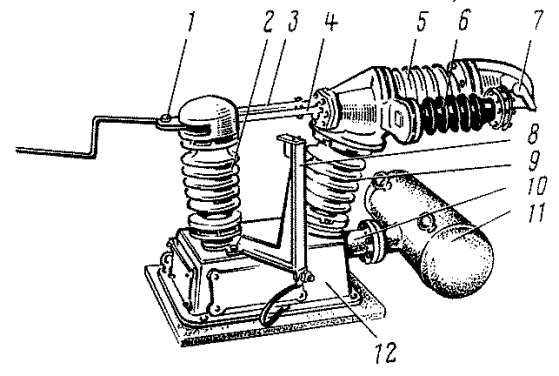 Основой выключателя ВОВ-25-4М, установленного на отечественных электровозах, является силуминовый корпус 12 (рис. 2), которым выключатель крепится к крыше электровоза. Уплотнение между корпусом и крышей обеспечивается резиновым шнуром. К корпусу с помощью патрубка прикреплен воздушный резервуар 11 емкостью 32 л. Во время процесса отключения сжатый воздух из резервуара подается в дугогасительную камеру через патрубок 10 и полость наклонного изолятора 9. Из резервуара выведена трубка, предназначенная для выпуска сжатого воздуха и конденсата. Трубка оканчивается в корпусе штуцером, к которому подсоединяется труба с запорным вентилем. Другой штуцер служит для подсоединения питающего воздухопровода.