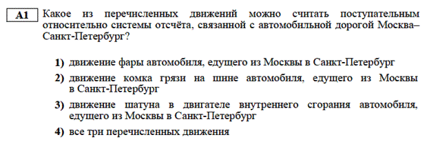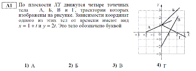Решение. Это тоже фото на телефон, впопыхах, поэтому качество ни о чём. Но разобрать текст всё-таки можно. Решение довольно простое. Оно вытекает из самого определения ускорения. Ускорение - это отношение изменения скорости к промежутку времени, в течение которого это изменение произошло. Из этой формулы вытекает такая Таким образом, верный ответ № 4. Задача А1 из тренировочной работы 11 апреля 2013 годаДля решения надо понимать две вещи: 1) Знать что такое поступательное движение и вращательное движение. 2) Хоть чуть-чуть представлять себе мотор автомобиля, по меньшей мере представлять, как движется шатун. По первому вспомним: ПОСТУПАТЕЛЬНОЕ ДВИЖЕНИЕ ТЕЛА - такое, когда все точки этого тела описывают одинаковую траекторию. Или еще формулируют так: любой отрезок этого тела перемещается параллельно самому себе. Почитайте об этом в заменитом учебнике Ландсберга. А ВРАЩАТЕЛЬНОЕ ДВИЖЕНИЕ - это когда каждая точка тела описывает окружности с центром в одной точке, которая называется ОСЬЮ ВРАЩЕНИЯ. Комок грязи, естественно вращается вместе с колесом. Шатун совершает довольно сложное движение, но нижняя его головка, связанная с коленвалом, тоже вращается. А вот фара движется поступательно. Верный ответ № 1. Задача А1 из тренировочной работы 30 апреля 2013 годаРешение. Пусть t = 0. Получится x = 1 + 0 = 1. y = 2 * 0 = 0. Посмотрим, какому из четырёх отрезков принадлежит точка с координатами 1;0 ? Это отрезок В. Для того, чтобы убедиться в нашем ответе, давайте возьмем какую-нибудь другую точку отрезка В, например 0; -2. Подставим в условие. 0 = 1 + t. Отсюда t = -1. y = 2 * (-1) = - 2. Да, проверка подтвердила наше предположение, верный ответ № 3. Дальше мы будем публиковать ответы на присланные вами задачки. <<< Вернуться к теоретической подкладке --- Дальше к задаче А2 >>> |