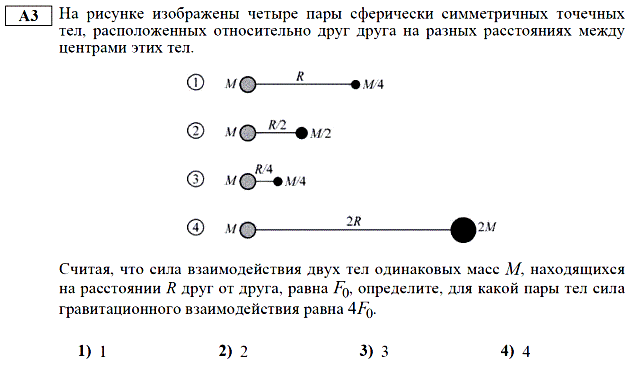 Она еще зависит от так называемой ГРАВИТАЦИОННОЙ ПОСТОЯННОЙ G, которая равна 6,7 на 10 в минус 11 степени (это не надо запоминать, это дано в каждом бланке ЕГЭ, как справочные данные). Теперь к задачке. В задаче сказано. Если бы каждое из двух тел имело бы массу М, а расстояние между ними было бы R, то сила притяжения равнялась бы Fнулевое. Когда сила станет в 4 раза больше? Вариант первый - она станет в 4 раза меньше, потому что масса второго тела М/4. Вариант два - масса в числителе уменьшается в два раза, зато расстояние в знаменателе уменьшается в два в квадрате, то есть в 4 раза. В итоге сила увеличится в два раза. Вариант три - в числителе в 4 раза, в знаменателе 4 в квадрате - то есть в 16 раз. В итоге сила в 4 раза. Это вернный вариант. <<< Или назад к А2 | Разбираем далее задачу А4 >>> |
