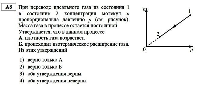 Решение. Мы видим, что при переводе газа из состояния 1 в состояние 2 оба параметра - и давление и концентрация уменьшаются. А концентрация - число молекул в единице объёма - это практически то же самое, что и плотность газа. Поэтому утверждение А, конечно же, неверно.
