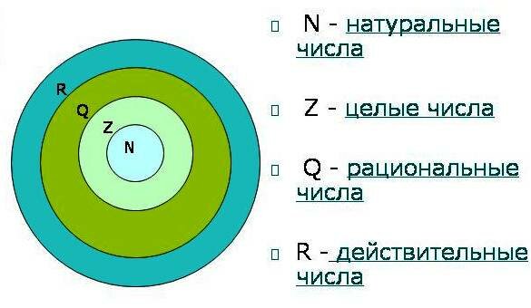 На картинке указано, какой буквой принято обозначать каждое множество, а круглая схема поясняет, что каждое предыдущее множество входит в состав следующего, более обширного. |
