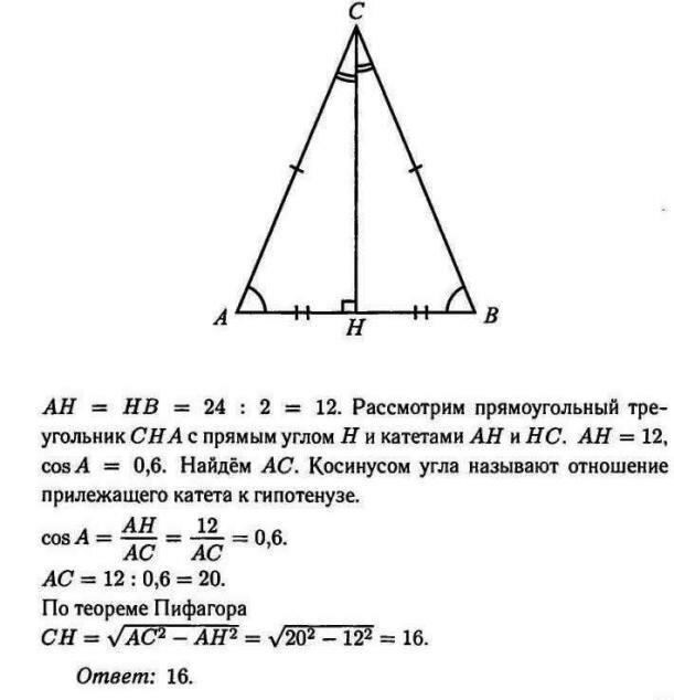 Высота, проведенная к основанию равнобедренного треугольника (то есть между двумя одинаковыми сторонами) одновременно является и МЕДИАНОЙ и БИССЕКТРИССОЙ. Термин МЕДИАНА означает, что она делит на равне части сторону треугольника, на которую падает. А БИССЕКТРИССА, как известно, это крыса, которая бегает по углам и делит угол пополам.