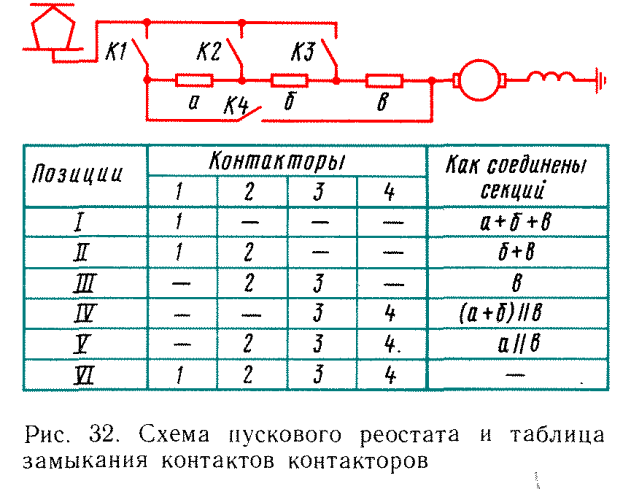 Большое число ступеней реостата при минимальном числе контакторов можно получить, используя различные комбинации соединений его секций. Для того чтобы знать, на какой позиции замкнуты или разомкнуты те или иные контакты контакторов, а следовательно, какие секции реостата включены и каким образом, составляют таблицу замыкания контакторов (рис. 32). Так, если замкнуть контактор К1, при разомкнутых остальных контакторах секции а, б и в будут включены последовательно. Замкнув контакты контактора К2, выключают секцию а; при замкнутых контактах контактора КЗ в силовую цепь введена только секция в.