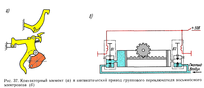 На восьмиосных электровозах для перехода с последовательного соединения на последовательно-параллельное, осуществляемого замыканием четырех тяговых двигателей на секции пускового реостата, применены групповые переключатели, имеющие четыре контакторных элемента, вал с четырьмя кулачками (по числу контакторных элементов), пневматический привод и блокировочное устройство. Кулачки (рис. 37, а) имеют выступы и впадины. Выступы кулачков при повороте вала набегают на ролики подвижных контактов, что приводит к замыканию контактов контакторных элементов; впадины позволяют контактам размыкаться. Последовательность замыкания и размыкания контактов группового переключателя определяется очертанием кулачков и взаимным их расположением на валу. Пневматический привод (рис. 37, б) включает в себя цилиндр, два поршня, соединенных зубчатой рейкой, два электромагнитных вентиля В1, В2 и воздухопроводы, подводящие к приводу сжатый воздух. Чтобы управлять подачей сжатого воздуха, используют электропневматические вентили. Вентиль В2 включающего типа, В1 — выключающего. Выключающий вентиль отличается от включающего только расположением клапанов. При обесточенной катушке выключающий вентиль открывает доступ сжатому воздуху в полость цилиндра. Если же возбудить катушку, то полость цилиндра через вентиль сообщится с атмосферой.