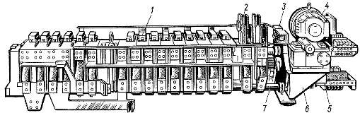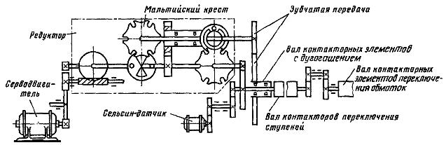 ГЛАВНЫЙ КОНТРОЛЛЕРПереключатели ступеней для регулирования на вторичной стороне трансформатора. На электровозах ВЛ80т, ВЛ80к, ВЛ60к все переключения цепей питания выпрямителей тяговых двигателей производит один аппарат — переключатель ступеней, выполненный в виде группового контроллера ЭКГ-8 (электровозный контроллер главный). Он представляет собой набор кулачковых контакторных элементов (кулачковых контакторов), производящих переключения. Каждый из них имеет свою кулачковую шайбу, профилем которой определяется включенное или отключенное состояние контакторного элемента на заданных позициях контроллера. Кулачковые шайбы насажены на три вала взаимно связанных соответствующими механическими передачами, благодаря чему все операции замыкания и размыкания контакторов происходят в строго определенной последовательности. С основными кулачковыми валами зубчатыми передачами связаны кулачковые валы блокировочных контакторных элементов (блок-контактов), замыкающихся и размыкающихся на заданных ступенях регулирования. Рис. 57 Главаный контроллер При наборе позиций кулачковые валы вращаются в одну сторону и контакторы включаются и отключаются в определенной последовательности. В процессе сброса позиций кулачковые валы вращаются в другую сторону и контакторы включаются и отключаются в обратной последовательности. Необходимую очередность работы контакторных элементов обеспечивают, подбирая для каждого элемента соответствующий профиль кулачковой шайбы. Кулачковые валы имеют двигательный привод, так называемый серводвигатель (от англ. serve — обслуживать), которым управляет машинист с помощью контроллера машиниста, расположенного в кабине. Кинематическая схема главного контроллера сложна (рис. 58). Рис. 58 Кинематическая схема главного контроллера Серводвигатель с помощью зубчатых колес и червячного зацепления приводит во вращение через первый мальтийский механизм (мальтийский крест) и зубчатую передачу кулачковый вал контакторов с дугогашением, а через зубчатую передачу и второй мальтийский крест — кулачковые валы контакторов переключения ступеней и контакторов переключения обмоток. Эти два вала связаны зубчатой передачей, обеспечивающей необходимую последовательность переключения обмоток и секций. В начало статьи |