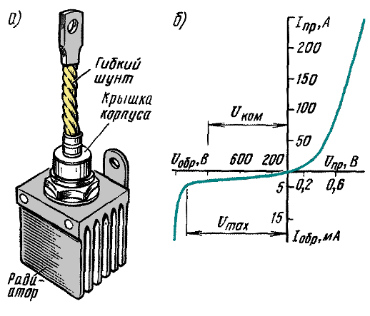 У силового диода (рис. 59, а) наружный конец гибкого вывода является одним из электродов вентиля, на него насажен стандартный наконечник для включения прибора в схему. Положительный электрод называется анодом, а отрицательный — катодом. Направление тока в вентиле (от верхнего гибкого вывода к основанию или, наоборот, от основания к выводу) указывают значком на корпусе вентиля. Охладители имеют массивное основание и ребра, увеличивающие поверхность охлаждения.