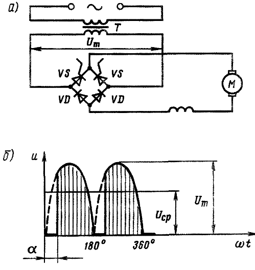 Как же осуществляется плавное регулирование? В выпрямителе, собранном на тиристорах VS по схеме моста (рис. 64, а), можно изменять угол а их включения, т. е. подавать в соответствующие моменты управляющие импульсы тока Iу (см. рис. 60).