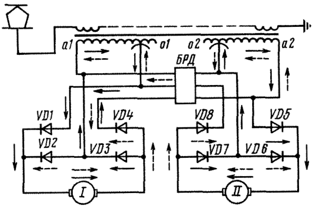 В следующий полупериод напряжение в обмотках действует справа налево. Ток из обмотки 01-а1 проходит через плечо VD6, двигатель II, плечо VD8 и возвращается в обмотку 01-а1 трансформатора. Ток из обмотки а.2-02 идет через плечо VD2, двигатель I, плечо VD4 и возвращается в обмотку а2-02. Следовательно, двигатели в течение одного периода изменения тока поочередно подключаются сначала к одной («своей») вторичной обмотке, а затем к другой («чужой»). Тем самым обеспечивается одинаковое среднее напряжение на всех тяговых двигателях при неравных напряжениях во вторичных обмотках трансформатора.