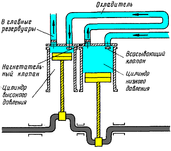 Из цилиндра низкого давления сжатый воздух проходит через охладитель и поступает в цилиндр высокого давления, поршень которого в это время движется вниз, способствуя всасыванию поступающего воздуха. Охладителем служит радиатор или воздухопровод, соединяющий цилиндры низкого и высокого давления и размещаемый обычно на крыше электровоза. Учитывая, что воздух предварительно сжимается в цилиндре низкого давления и объем его при этом уменьшается, цилиндр высокого давления делают меньшего диаметра. Воздух из цилиндра высокого давления нагнетается в главные резервуары, которые чаще всего располагают на крыше электровоза.