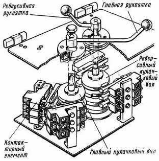 На электровозах без электрического торможения (ВЛ60к, ВЛ80к) контроллер машиниста (рис. 90) выполнен с двумя валами: главным и реверсивным, совмещенным с валом ослабления возбуждения. Контроллер имеет две рукоятки управления — съемную реверсивную и главную.